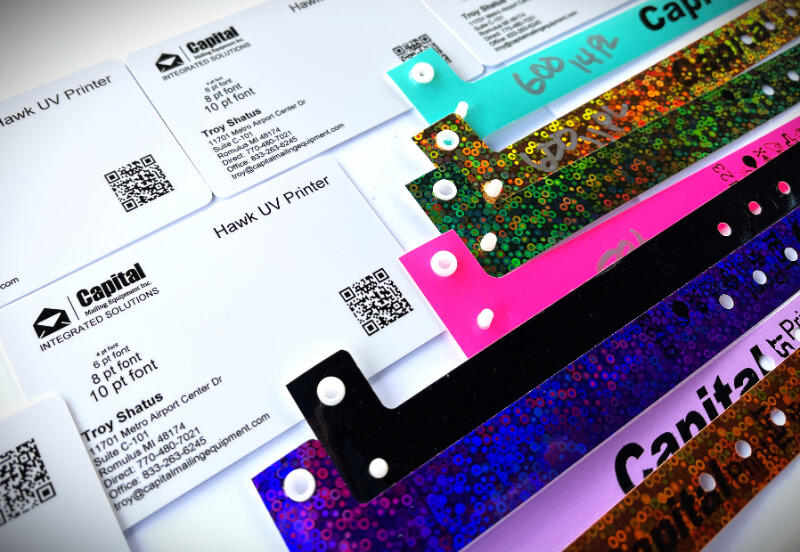 Drop-on-Demand ink jet printing system mounted on Walco transport base. This is our newest seventh generation system. The system has One 4.25-inch-wide imager with a native resolution 600 dpi across transport and operator selectable in direction of product travel. Print speeds are up to 500 fpm dependent upon resolution, substrate and drying. This flexible system can use either UV curable or water based inks. Common colors of ink are available. Print registration can be triggered by a standard mark sensor detecting lead edge of sheet. Print on virtually all substrates including plastic cards! Instant power on and ready to print.