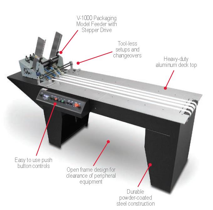 Heavy-duty construction ● 5-foot deck length ● Dual vacuum belts ● Adjustable outside belts ● Easy to use push button controls ● Aluminum deck top ● V-1000p feeder featuring repositionable feed belts ● Independent side guide positioning ● Extended guide rails all the way through the feeder ● Two independent adjustable product separators ● Long lasting natural gum rubber feed belts ● Variable speed control ● Maintenance free stepper motor ● Universal external run interface kit.